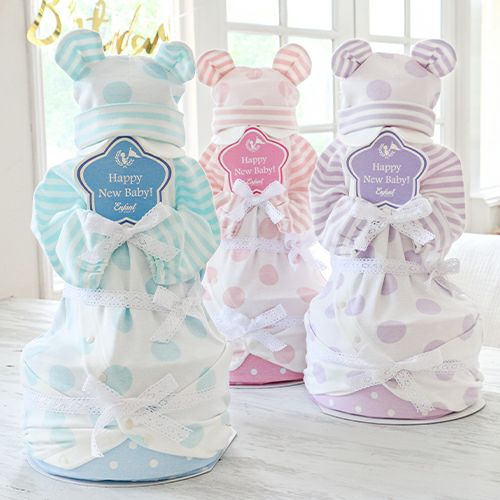 オリジナルのベビーウェア・キャップ・ おむつで作り上げた他にはない印象的なおむつケーキ。